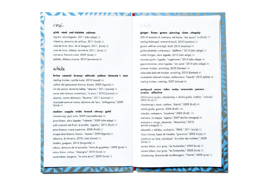 Visual Dialogue began with a visual brief brainstorm to uncover the ideas behind the new venture. From this exercise came the main ingredients of the identity—a hand-drawn logo to suggest the personal touch combined with a geometric pattern inspired by the Italian tile used throughout the space. The palette of bold colors with metallic silver popped against the natural materials used in the interior design. French-fold menus doubled as keepsakes, and a blog-format website kept guests in the know.