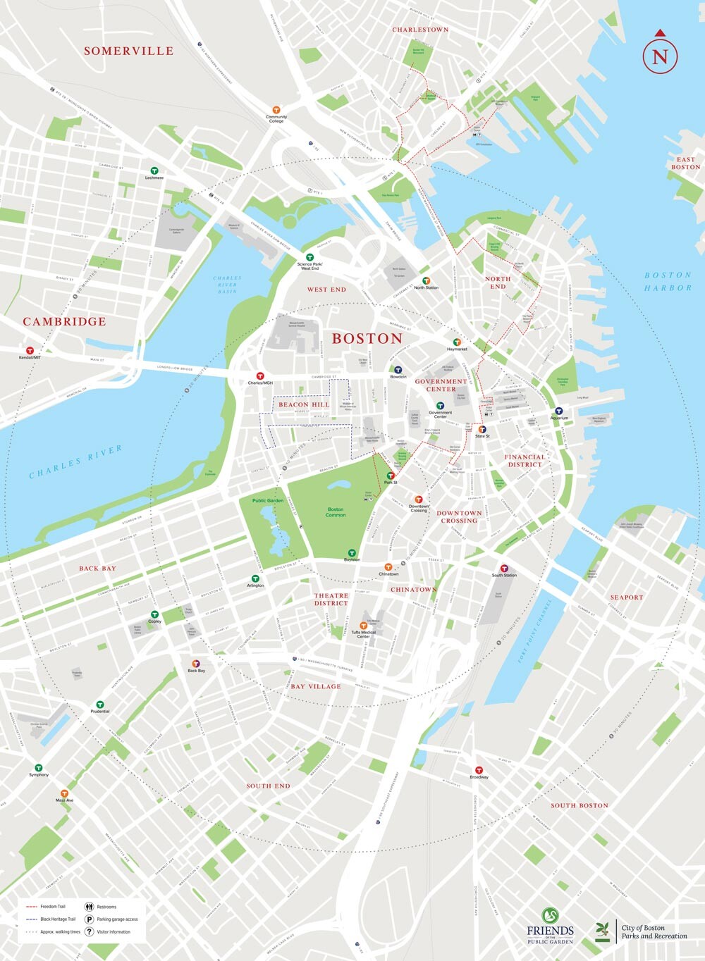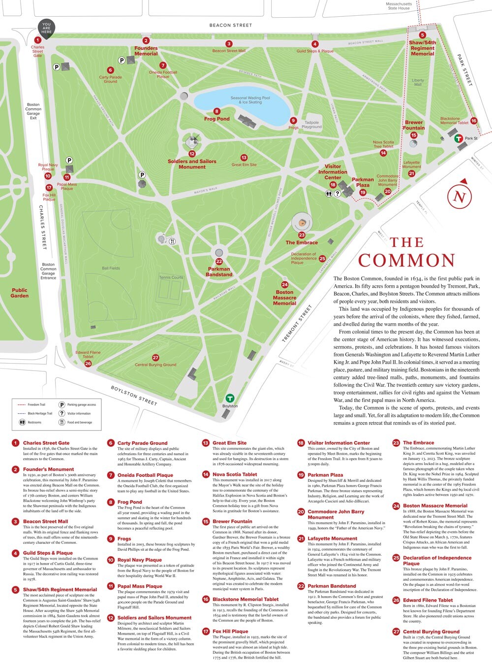 We updated the Boston Common map to feature contemporary attractions and monuments, including The Embrace, and clarified the park’s many points of interest. A new labeling system connects numbered sites on the map to descriptive text, encouraging self-guided exploration.