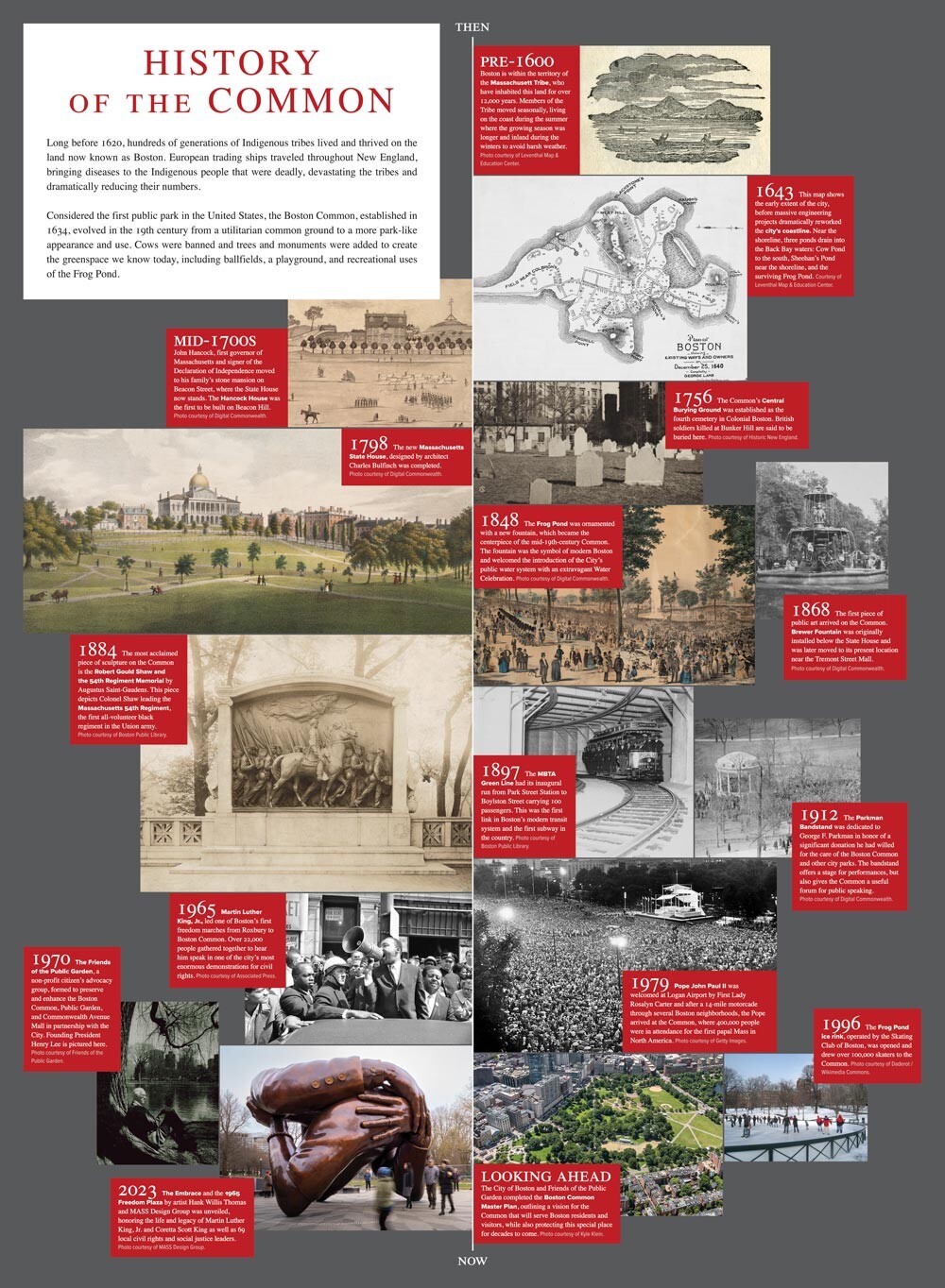 Despite the abundance of fascinating stories in the park’s history, the previous panel presented them in a practically unreadable way. For the refreshed design, we curated a blend of archival and modern photography to convey a timeline of the Common’s evolution over nearly four centuries.
