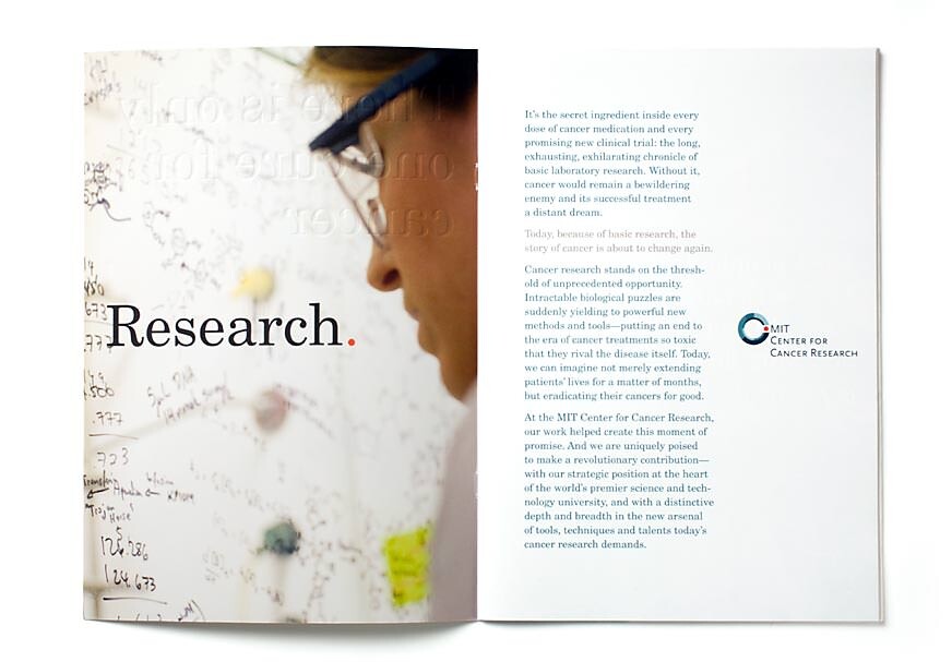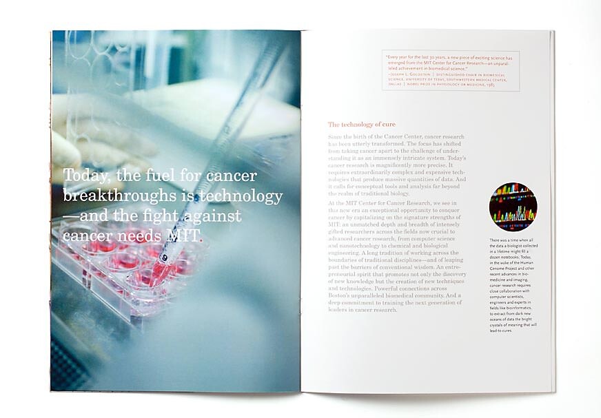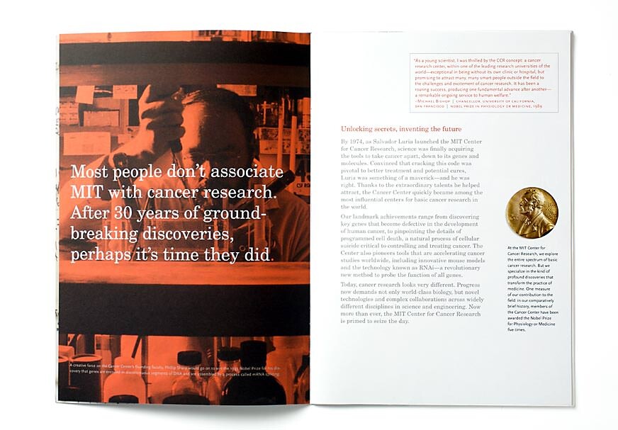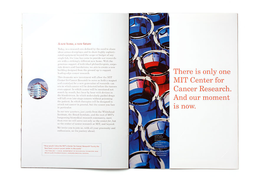 Visual Dialogue developed an engaging brochure that defines MIT CCR as the place for cancer research. A simple, yet provocative statement on the cover generates immediate interest and entices readers with the hint of the payoff inside. The main copy and photos outline the past, present and future of the center, while additional content is highlighted in the sidebar. We believed that these materials contributed to their ability to successfully secure funding for their new building and, in a way, will help beat cancer.
