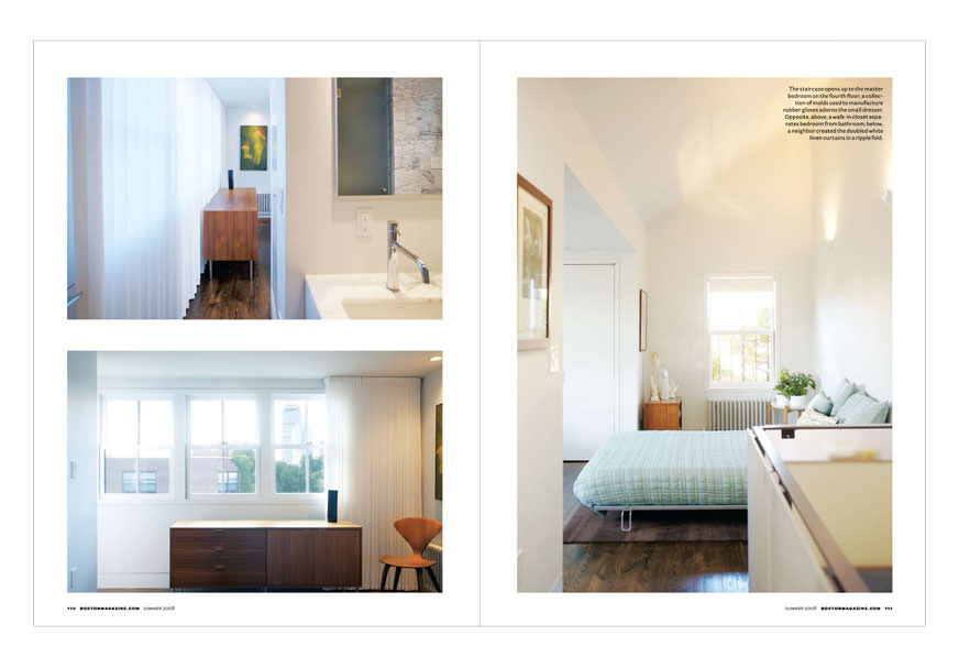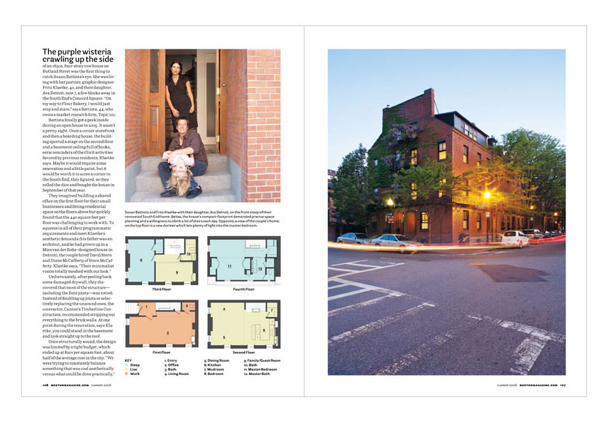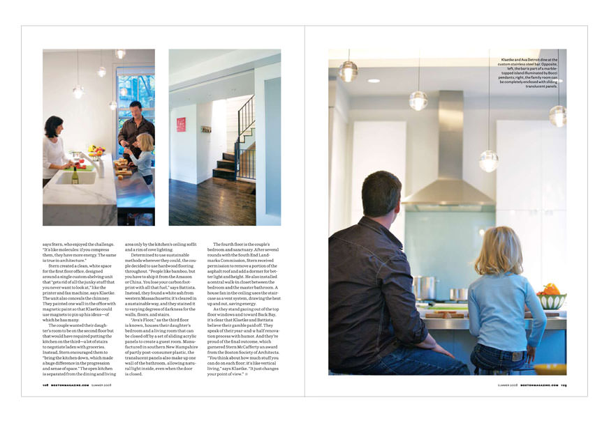 Fall will be here before you know it, so pick up the summer issue of Boston Home for a feature on the South End home of Visual Dialogue. The article details the renovation of the 1850 row house into a modern space for work (on the bottom 2 floors) and living (on the 3 floors above). This adaptive reuse project also won a 2008 Boston Society of Architects award for Stern McCafferty, the architects we worked with closely to achieve our vision for the building.