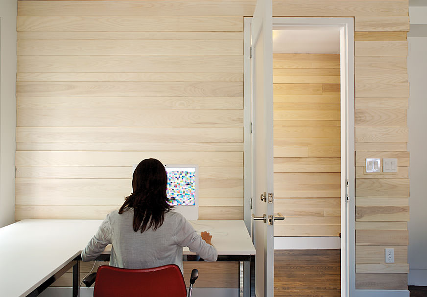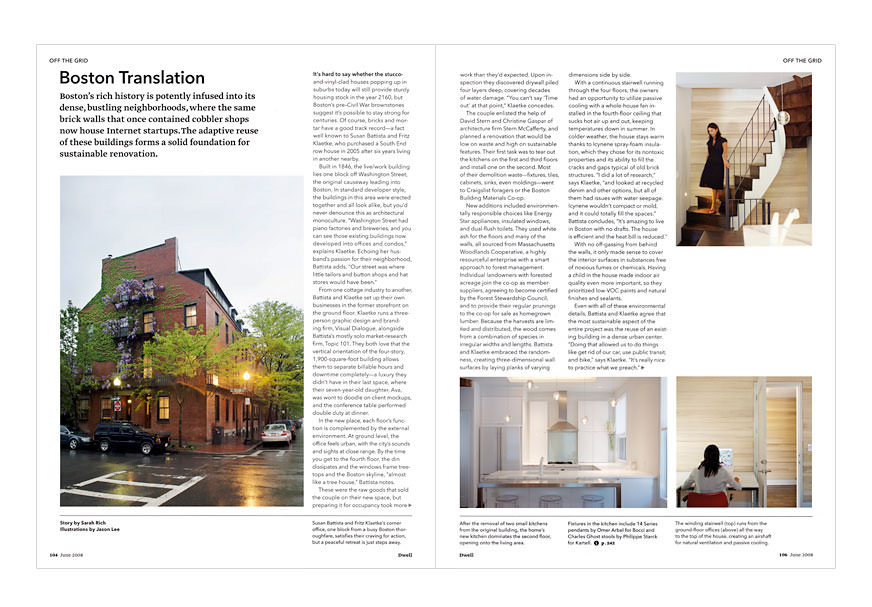 On newsstands now, the latest issue of Dwell features the live/work space of Fritz Klaetke (Visual Dialogue) and Susan Battista (Topic 101). The article “Boston Translation” is in the Off The Grid section and focuses on the sustainable features of the interior renovation, a collaboration with architects Stern McCafferty. According to Dwell, “each floor’s function is complemented by the external environment. At ground level, the office feels urban, with the city’s sounds and sights at close range. By the time you get to the fourth floor, the din dissipates and the windows frame treetops and the Boston skyline.” Feel free to schedule a personal tour.
