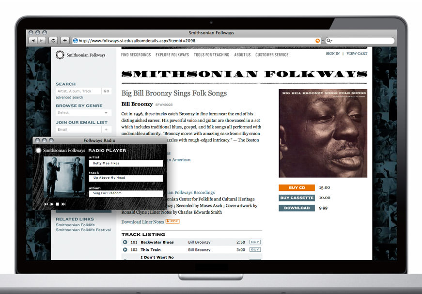 The Smithsonian Institution just launched new websites for The Center for Folklife and Cultural Heritage, Smithsonian Folkways Recordings, and the Folklife Festival—all designed by Visual Dialogue. The sites are organized to express their distinct but connected content to audiences ranging from cultural scholars to the general public. Perhaps with the Obama administration in charge, design for the U.S. government is getting better…
