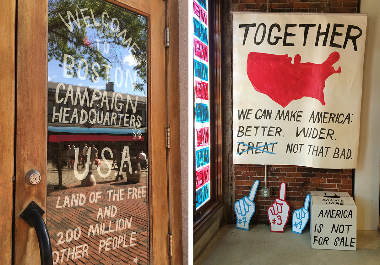 As we celebrate our nation’s 240th Independence Day, we invite you to visit historic Faneuil Hall and “Boston Campaign Headquarters.” Come see the art installation by Pat Falco and friends that the Boston Globe calls “nonpartisan, cynical—and funny.” Located next to our pop-up shoppe 1630 and open daily from noon to 6pm. Or visit online at bostoncampaignhq.com.