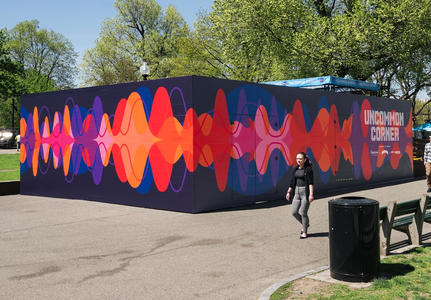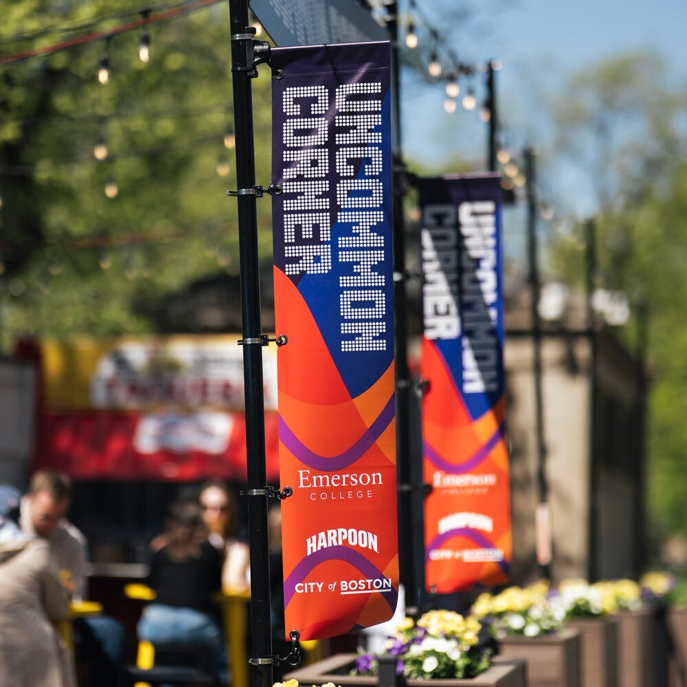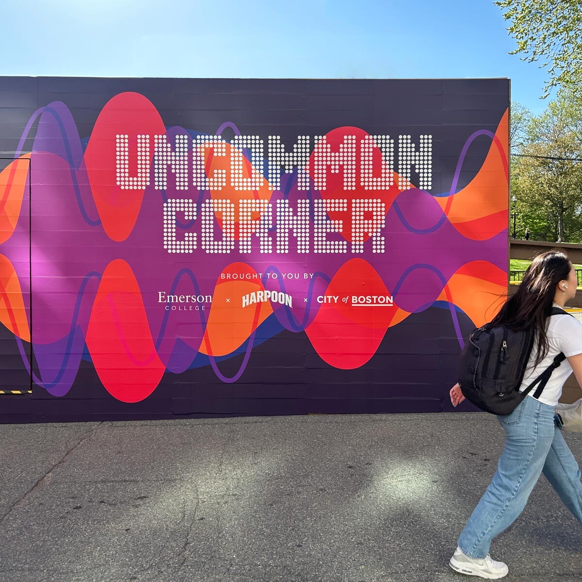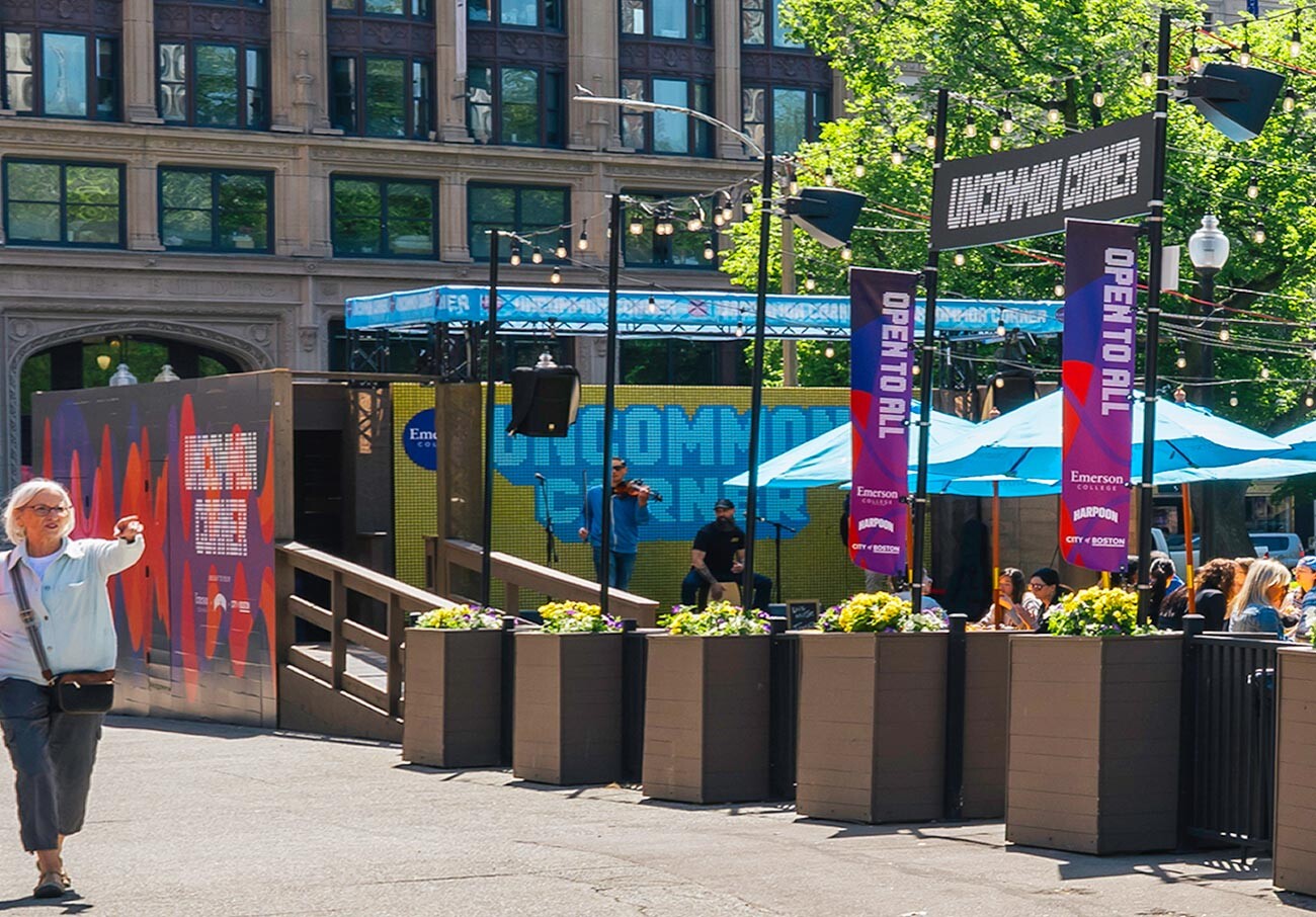 But how do you brand the space? We loved the play on the Boston Common with “uncommon,” but the previous name “UnCommon Stage” solely suggested a performing arts space (even though there isn’t always someone on stage). So we renamed it UNCOMMON CORNER, allowing Emerson to “own” that corner of the park. The name’s graphic treatment suggests marquee lights and led to other possibilities…