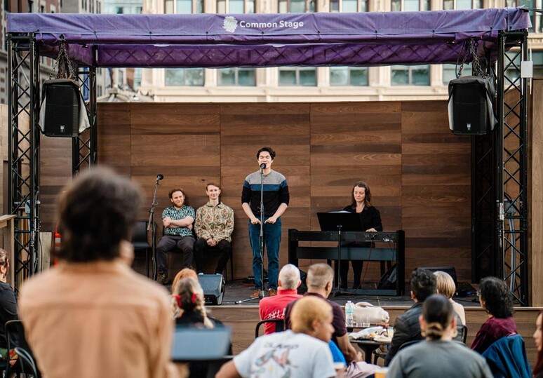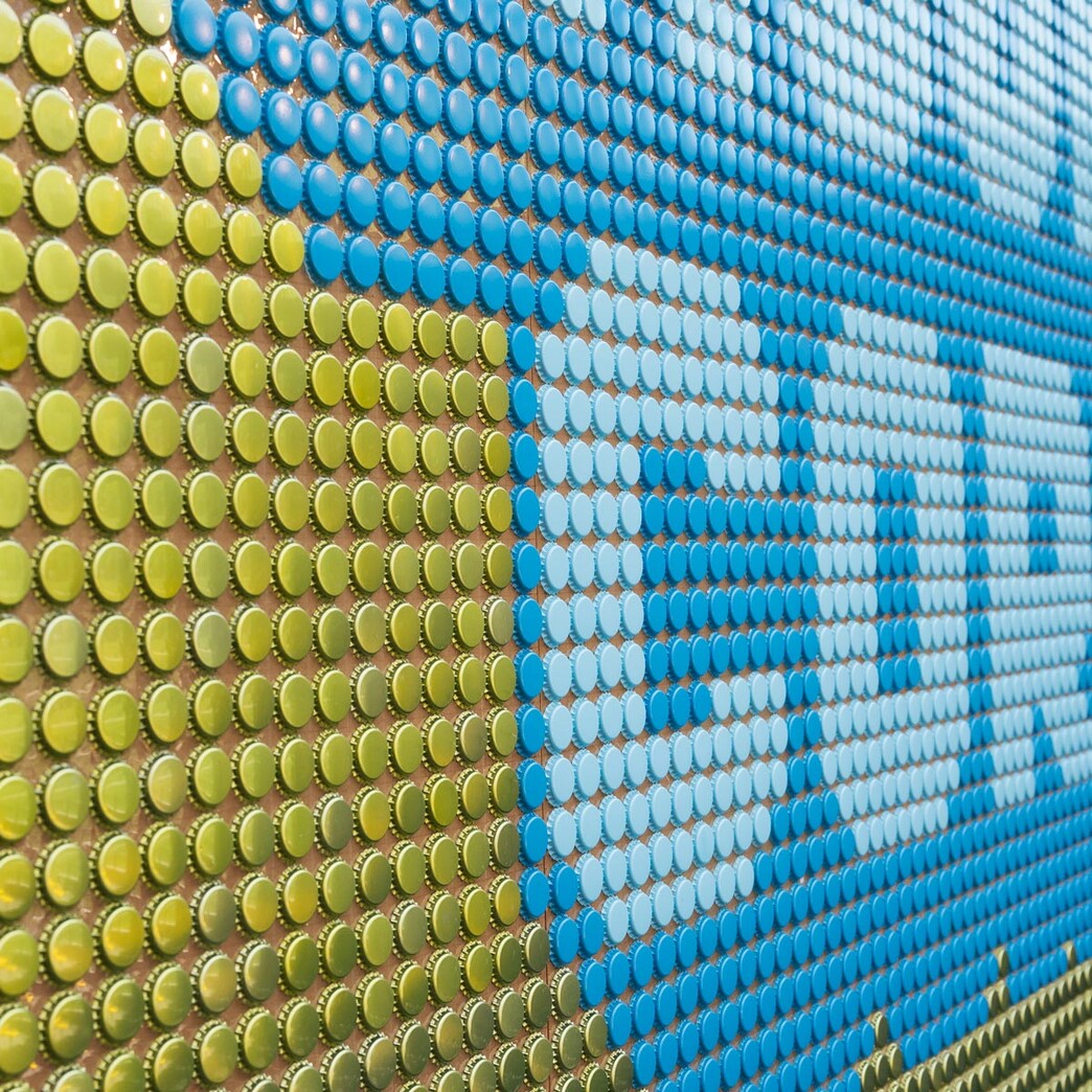 …like a back wall for the stage created out of 10,944 bottle caps, becoming an instant Instagrammable moment (meticulously hand-assembled by Andrew Bablo). Above the stage, a sky blue awning shields performers from the sun and announces the space to everyone in the surrounding buildings.