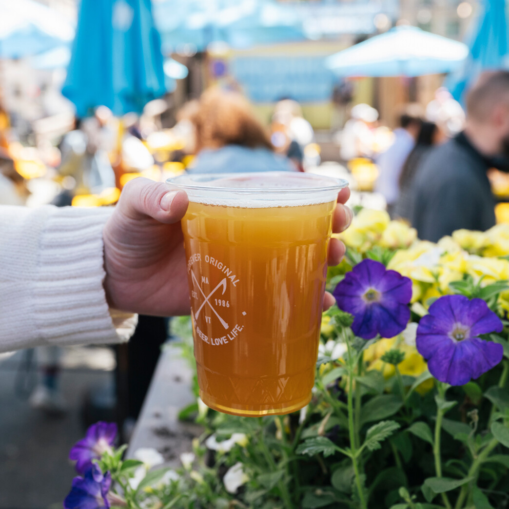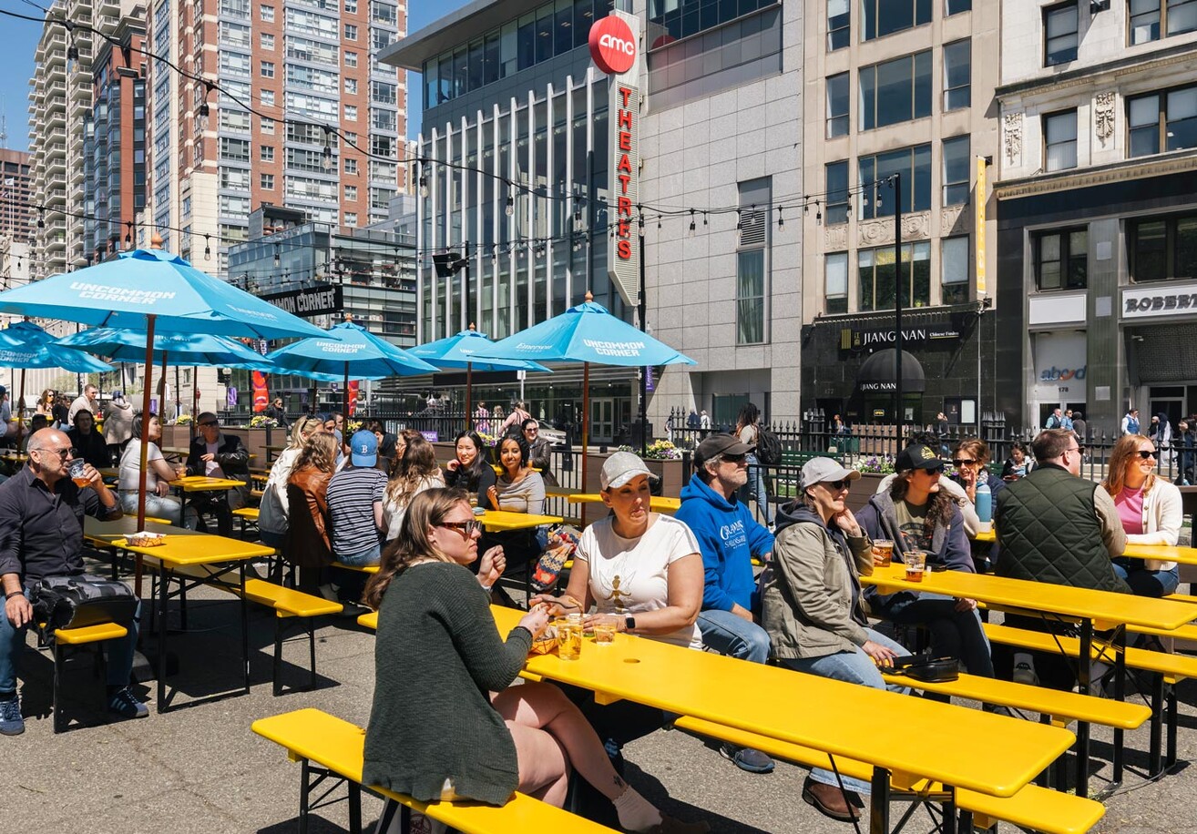 Our design for the space extended to the selection of all furniture. Generic outdoor tables and chairs were swapped out for communal beer garden tables and high-tops in a bold (and on-brand) yellow. Custom sky blue umbrellas for shade accompany the tables.
